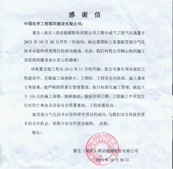 氣化裝置是繼其他各套系統(tǒng)開車成功后最后開車的核心裝置。它的成功開車標(biāo)志著全部施工任務(wù)圓滿完成。分公司在該項(xiàng)目上創(chuàng)造了工程進(jìn)度、質(zhì)量安全、業(yè)主服務(wù)三個(gè)一流,用心血和汗水為業(yè)主奉獻(xiàn)了精品工程,展示了化建湘軍的風(fēng)采,更獲得了業(yè)主來信高度贊揚(yáng)!