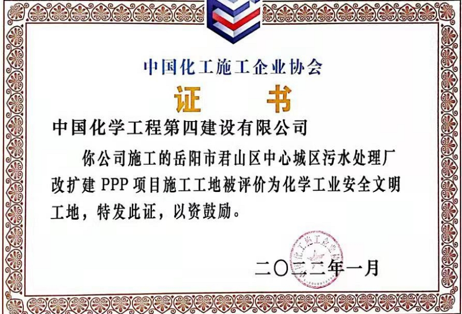 近日,從中國化工施工企業(yè)協(xié)會傳來喜訊,由市政工程公司承建的岳陽市君山區(qū)中心城區(qū)污水處理廠改擴建PPP項目被評為“化學(xué)工業(yè)安全文明工地”稱號。