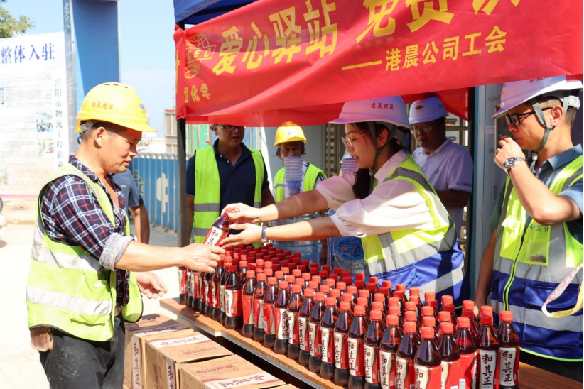 活動(dòng)中,港晨公司工會(huì)為一線參建者們搭建了“愛(ài)心驛站”,驛站內(nèi)配備防暑降溫物品、涼茶、礦泉水、冰棒,解決了一線工人在建設(shè)期間的飲水供給、納涼解暑等實(shí)際問(wèn)題,切實(shí)打造了一線工人的“加油站”“歇腳地”。