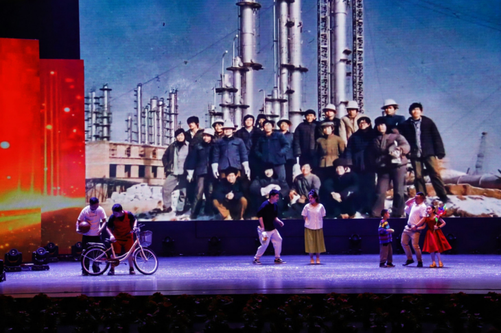 “青春逢盛世,奮斗正當時,化建青年,戰(zhàn)!”來自市政工程公司大型歌舞劇《盛世奮斗正青春》擲地有聲,傳遞出四化建70年崢嶸歲月間,一批批青年突擊隊員們砥礪奮進、攻堅克難的化建湘軍精神,他們用青春火紅的芳華換來保交樓房千萬間,一句句為黨為人民的錚錚誓言在劇場內回蕩。從荒原曠野到大漠孤煙,從五湖四海到大江南北,美輪美奐的舞蹈輪番上演,蘊含著四化青年磅礴的青春力量,奏響起盛世奮斗的強音,為觀眾們送上了一場視覺文化盛宴。