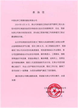 信中表示,在工程建設過程中,公司對項目建設高度重視,特別是特級動火作業期間,公司克服特級動火作業安全風險高、操作難度大、工期緊張、強降雨等諸多不利因素,積極協調各方、迎難而上,提前3天實現節點計劃。在項目部精心組織下,作業人員嚴格執行作業紀律,落實工作計劃,為項目如期通氣奠定了堅實基礎,贏得了江西省天然氣集團各部門一致贊譽。