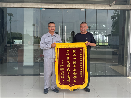 近日,君山區良心堡鎮望君洲村村民帶著“抗洪一線顯央企擔當,護村為民彰大義真情”的錦旗來到市政工程公司錢糧湖垸第三道防線工程項目部,對公司在團洲垸抗洪搶險關鍵時刻挺身而出,全力以赴、盡銳出戰,奮力完成防汛搶建任務表示感謝。