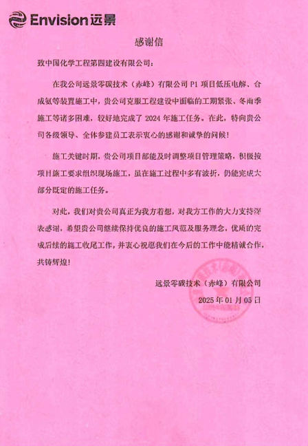 近日,東北公司收到遠景零碳技術(赤峰)有限公司發來的感謝信,對東北公司安全優質高效完成各項施工任務給予高度贊揚與衷心感謝。
