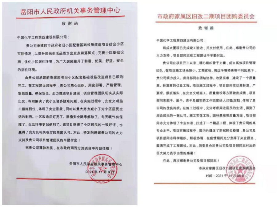 近日,建筑工程分公司和成大廈項目、岳陽市政府家屬區(qū)改造項目分別收到岳陽市政府家屬區(qū)舊改二期項目團(tuán)購委員會、岳陽市人民政府機(jī)關(guān)事務(wù)管理中心送來的兩封致謝函。