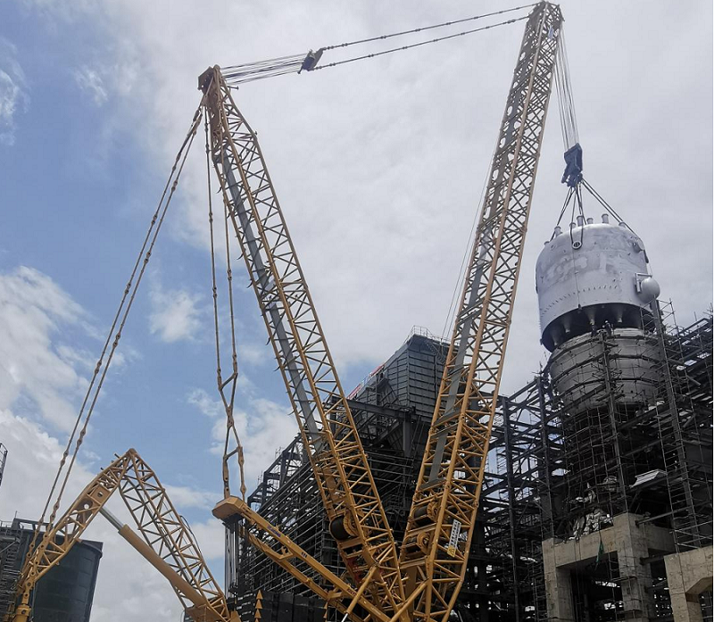 為順利完成該燒炭器的吊裝組對和確保工期,項(xiàng)目部組織人員加班加點(diǎn),僅一周就做好吊裝前各項(xiàng)施工準(zhǔn)備,為順利吊裝奠定了堅(jiān)實(shí)基礎(chǔ)。此次吊裝采用1250噸履帶吊主吊,經(jīng)過24小時(shí)奮戰(zhàn),成功完成燒炭器的吊裝組對。